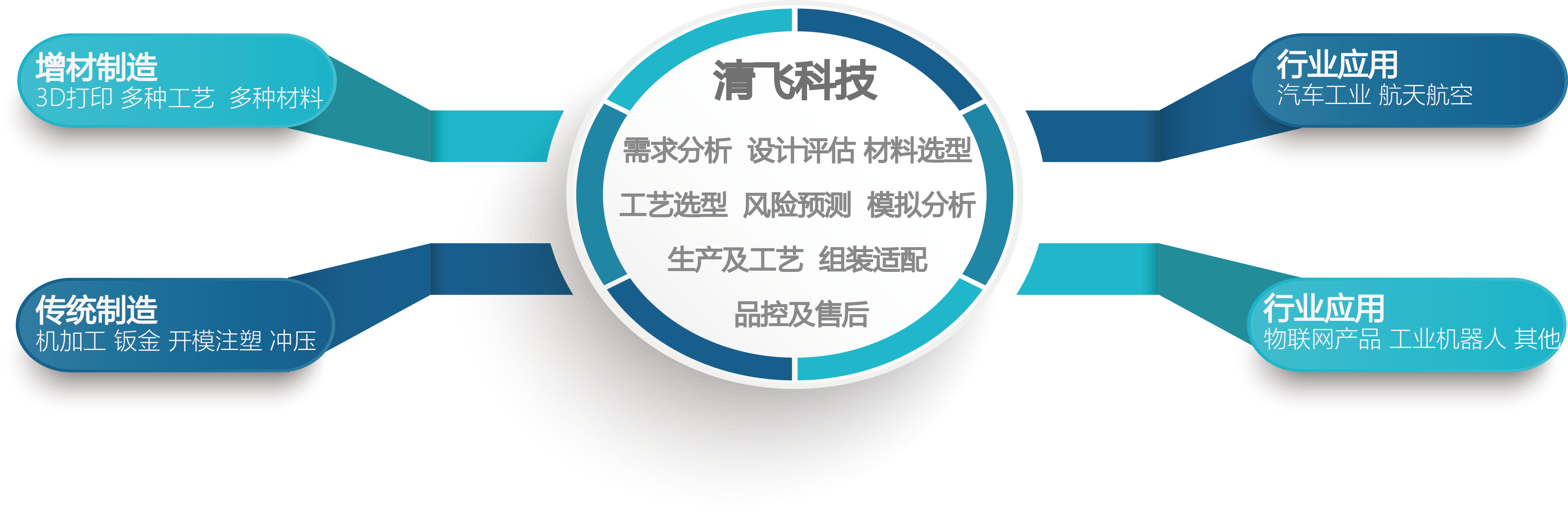 制造企业采用增材制造的方式来进行产品设计论证以及小批量特殊件的生产已成趋势,清飞科技着眼于为制造企业提供专业的技术服务支持,包括:需求分析、设计评估、数据校验、结构纠错、材料选型,生产工艺选型。我们强烈支持在设计论证过程中采纳高效的增材制造方式来进行验证,但我们采纳的混合制造方式,将更加适配制造企业在不同环境下、不同阶段中的深度需求。
